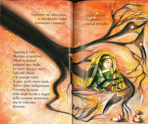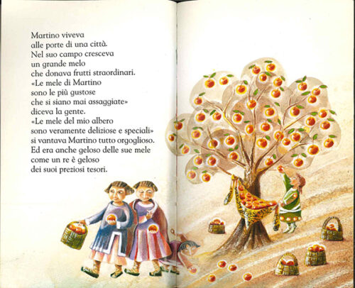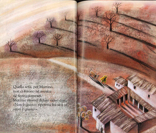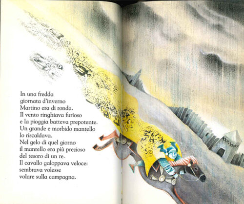 音楽家たちが町にやって来ました。人々はお礼をしません。マルティーノは100個のリンゴを渡しました。翌年、再びやって来たので、30個のリンゴを差し出しましたが、彼らは腹を立てました。時が経ち、マルティーノは成長しました。ある日、彼は馬に乗っていて、凍え死にそうな貧しい人に出会い、彼は自分のマントの半分を彼に与えました。すると、たちまち太陽が輝き始めました。