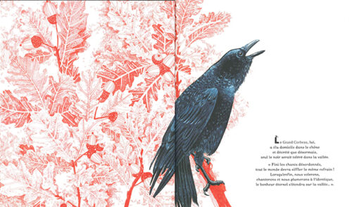 ある日、さまざまな鳥たちが暮らす静かな谷間にカラスが現れます。カラスは鳥たちを誘い、おいしい果実と引きかえに、自分の鳴き声「カーカー」と、黒い羽根の色をまねさせ、支配しようとします。多くの鳥が次第にカラスに従います。