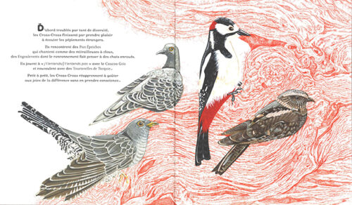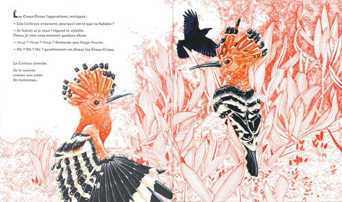 イラストを描いたヴィルジニー・ラピア(1974年-)は、フランス・ブルゴーニュ地方を拠点に活動しています。1999年からUSAAB(ブルゴーニュ高等応用芸術学校)でデザイン、イラストレーションなど応用美術を教えています。絵本にはさまざまな鳥たちが登場し、まさに鳥の楽園です。華やかで精緻に描かれた鳥たち。鳥ファンにはたまらない一冊です。