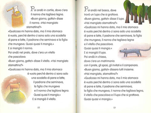 この絵本は、ニコレッタの20才代後半の作品です。現在の作風と違い、年少の子ども達向けの作品となっています。とてものびのびと、シンプルで、物語の内容をわかりやすく紹介しています。きれいな線、それにしっかり塗ったきれいなグラデーションを持つ色彩。とてもていねいに描かれています。どこか、特に人物の顔の雰囲気に、今の彼女の作品を忍ばせます。全編通じ、色彩や調子が一定で、小型の絵本ながら、高品質な作品となっています。